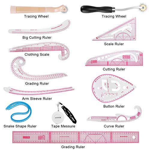 🍁【Update English Language Indicator Rulers 13PCS】Package including Ten Rulers, Button Ruler, Curve Ruler, Scale Triangle, Grading Ruler, Cutting Ruler, Clothing Scale, Arm Sleeve Ruler, Snake Shape Ruler; Two Tracing Wheel; One Tape Ruler; which can meet your different sewing or measuring demands.The pattern ruler use metric measurements (1 inch = 2.54 cm, 1 cm = 0.39 inch).