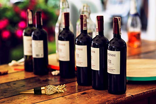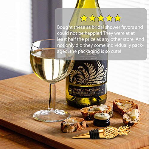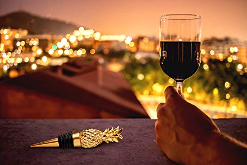 Pineapple Wine Bottle Stopper: The stopper features a 3-dimensional design pineapple top crafted in poly resin. The pineapple is finished in a shiny gold plating. The bottom of the stopper is gold metal and has a black rubber gasket for a tight seal