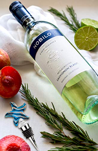 Starfish Design Wine Bottle Stopper: Each chrome finish silver metal wine bottle stopper has a conical base, wrapped with a black rubber gasket, topped with a solid glass charm in the shape of a starfish in a rich blue with metallic gold and black stripes