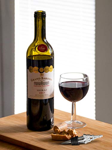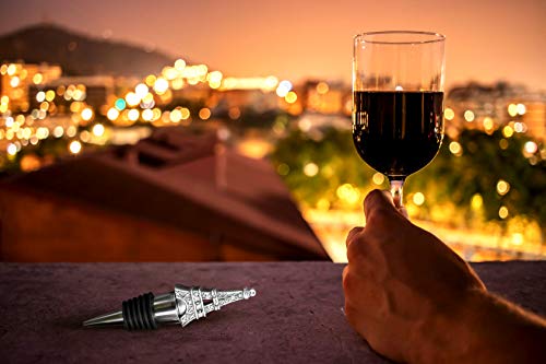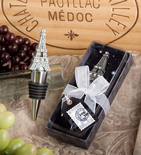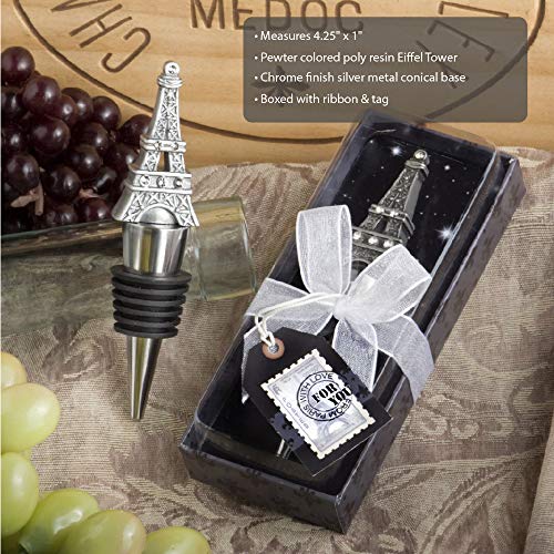 Eiffel Tower Bottle Stopper: Bottle stopper features a detailed pewter colored poly resin Eiffel Tower replica, enhanced with glistening rhinestones, atop a chrome finish silver metal conical base, wrapped with a black rubber gasket for a snug seal